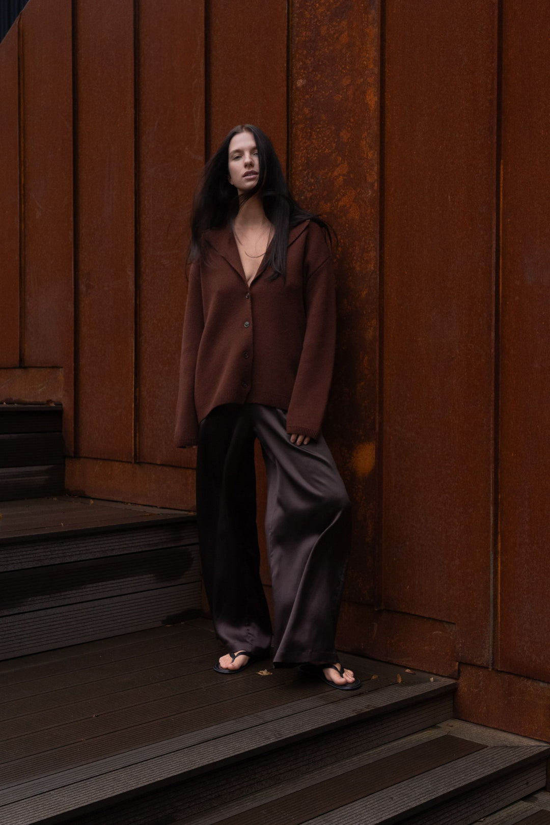 To celebrate the season in cozy elegance, For Lovers and Trees x Soil created a limited-edition holiday set: an irresistibly soft lambswool cardigan paired with fluid 100% silk trousers - crafted for warm moments with the ones you love.