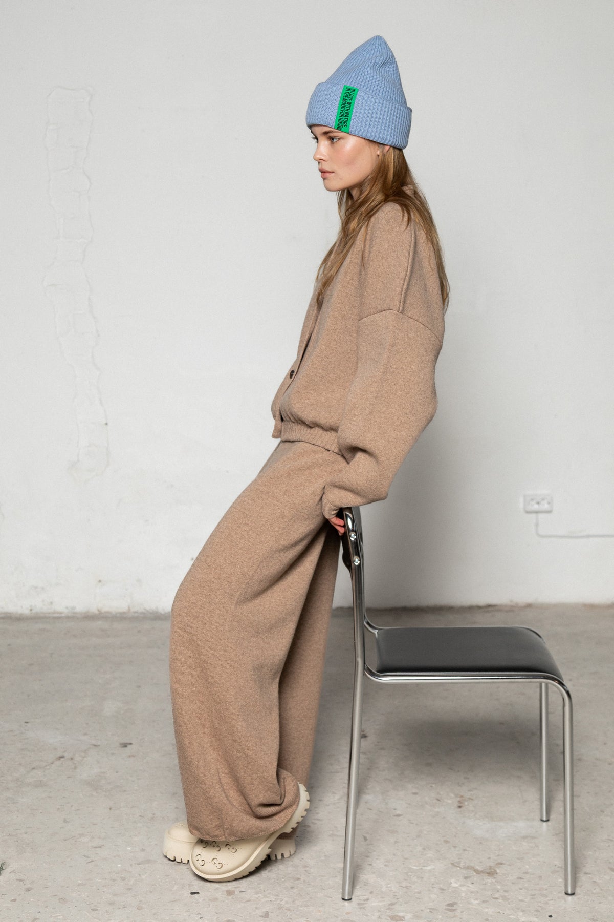 The beanie is complemented by the brand's signature quote "IN LOVE WITH NATURE. IN THE MOOD FOR HIKING." in chocolate brown. The beanie artfully showcases the brand's love for handcrafted touches and nature making it the perfect choice of the season.