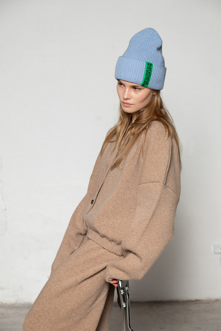 CLOUD BLUE LAMBWOOL BEANIE WITH CHOCOLATE LABEL