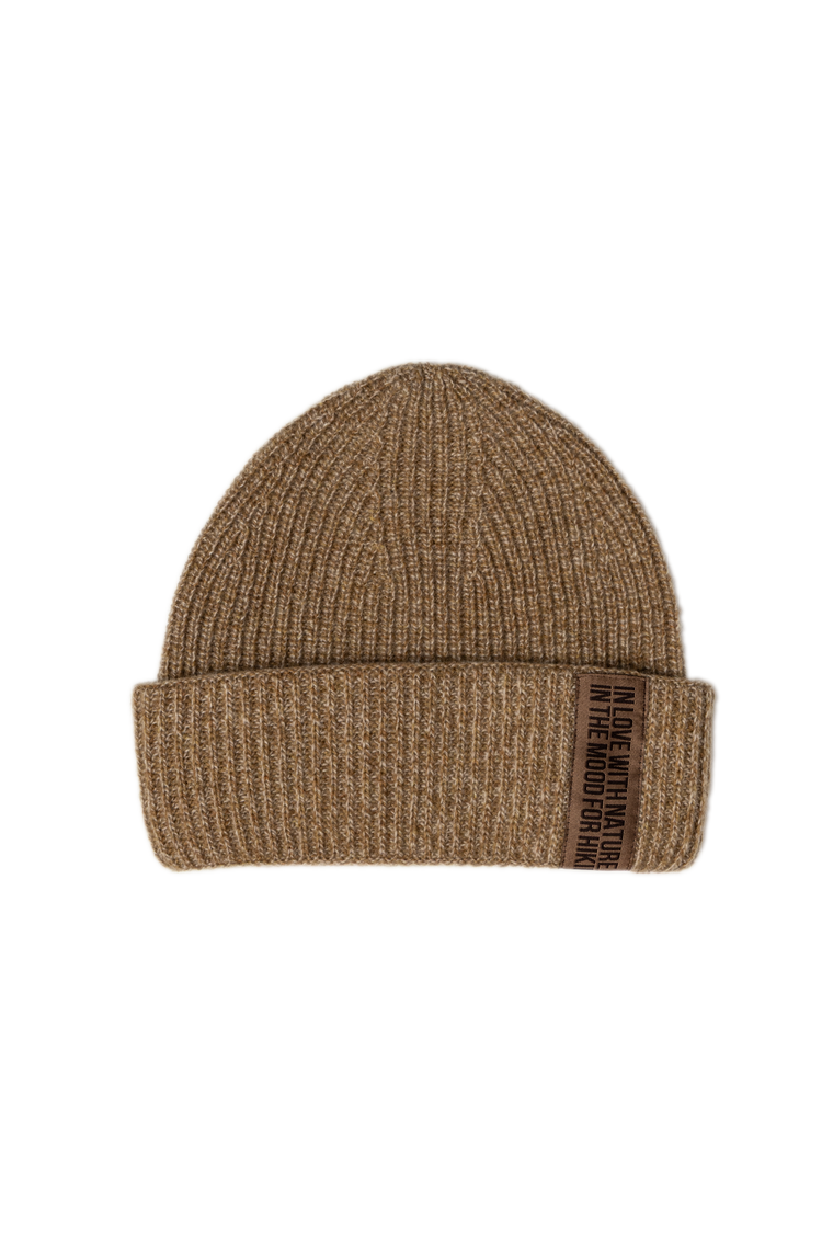 The beanie is complemented by the brand's signature quote "IN LOVE WITH NATURE. IN THE MOOD FOR HIKING." in chocolate brown. The beanie artfully showcases the brand's love for handcrafted touches and nature making it the perfect choice of the season.