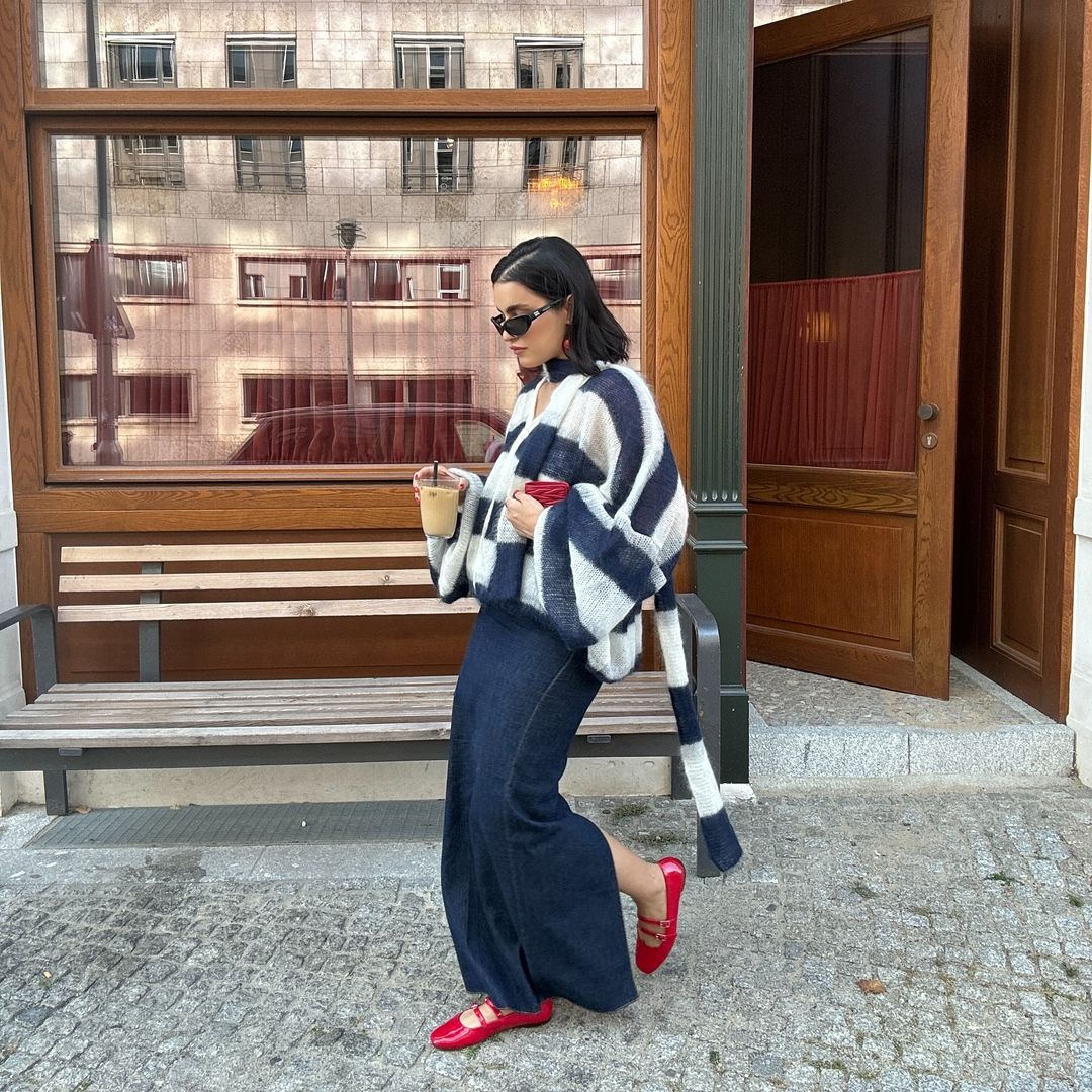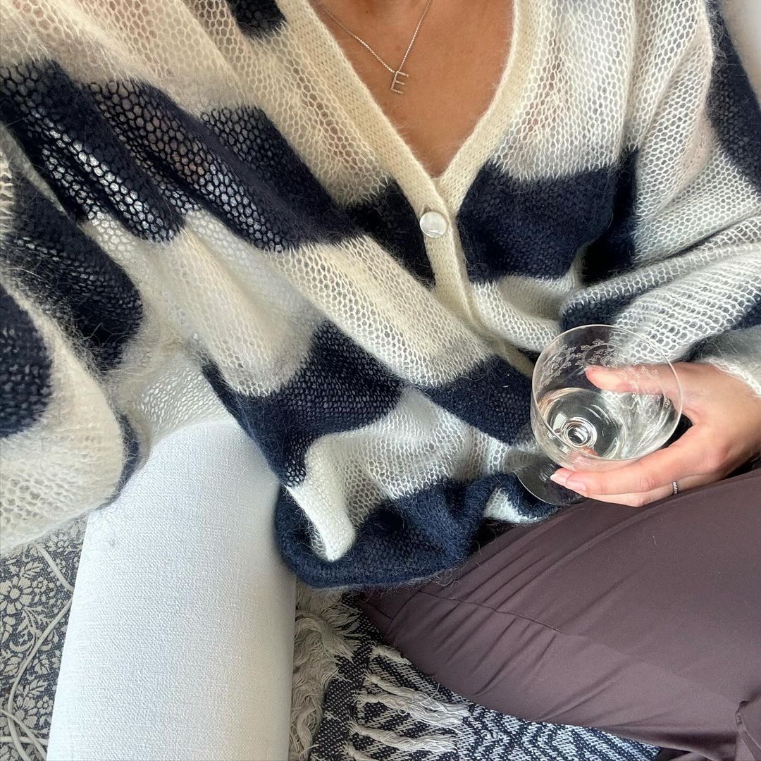 PEARL/NAVY STRIPED MOHAIR AND SILK CARDIGAN WITH SCARF