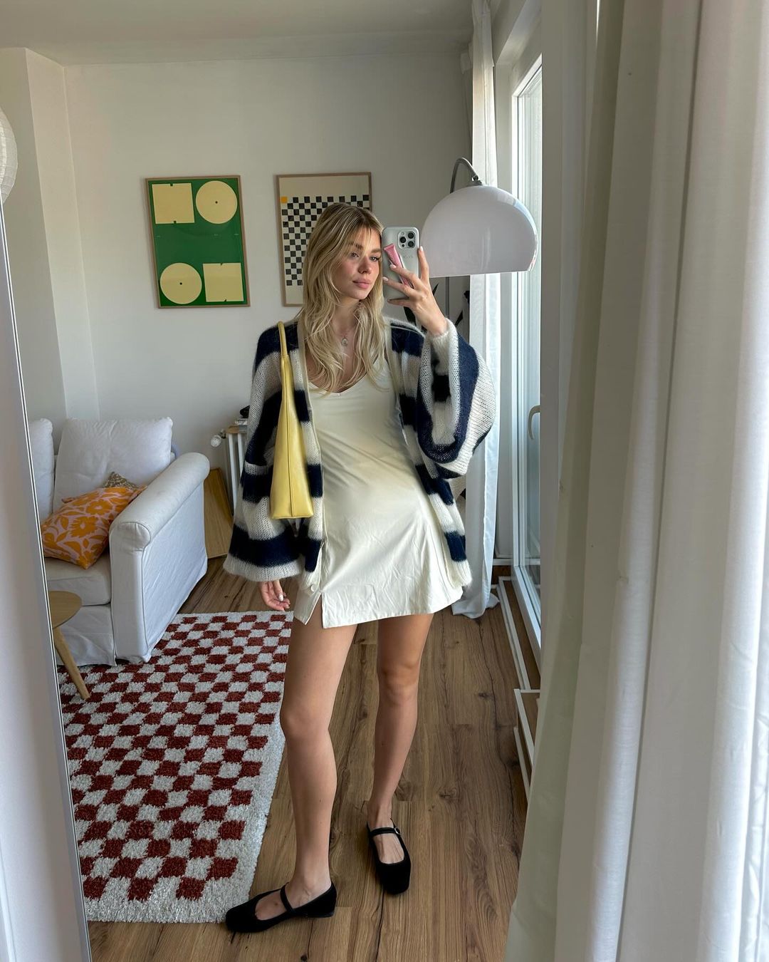 Soft as a cloud, this airy, open knit cardigan with dropped shoulders artfully showcases the brands love for handcrafted touches making it the signature piece of the collection.