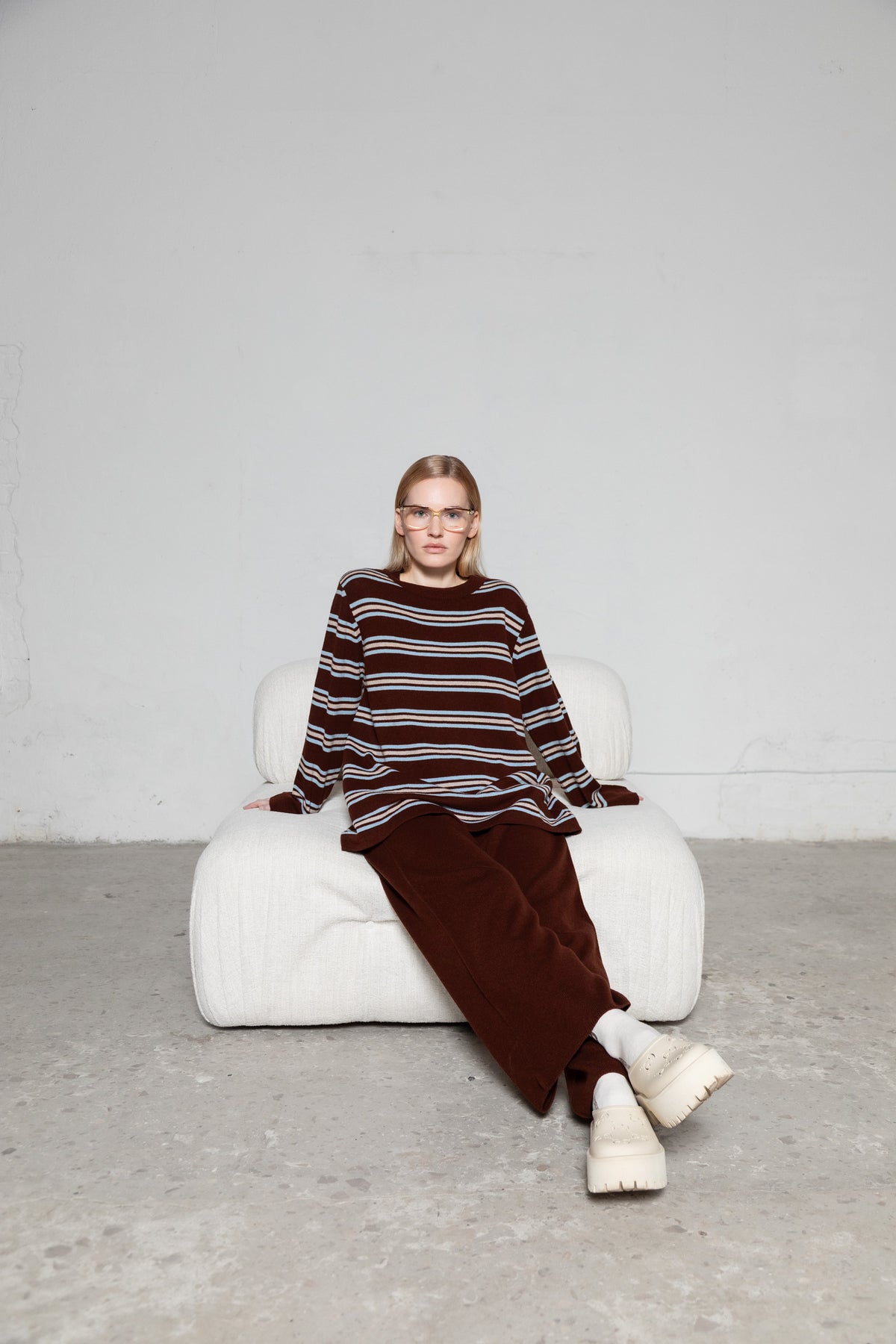 These trousers belong to the For Lovers & Trees x Isaya Elais The State of Being Lucky collection. A must-have for any capsule wardrobe, they can be styled with the matching striped shirt for an effortless look or paired with the mohair and silk cardigan for an elevated feel.