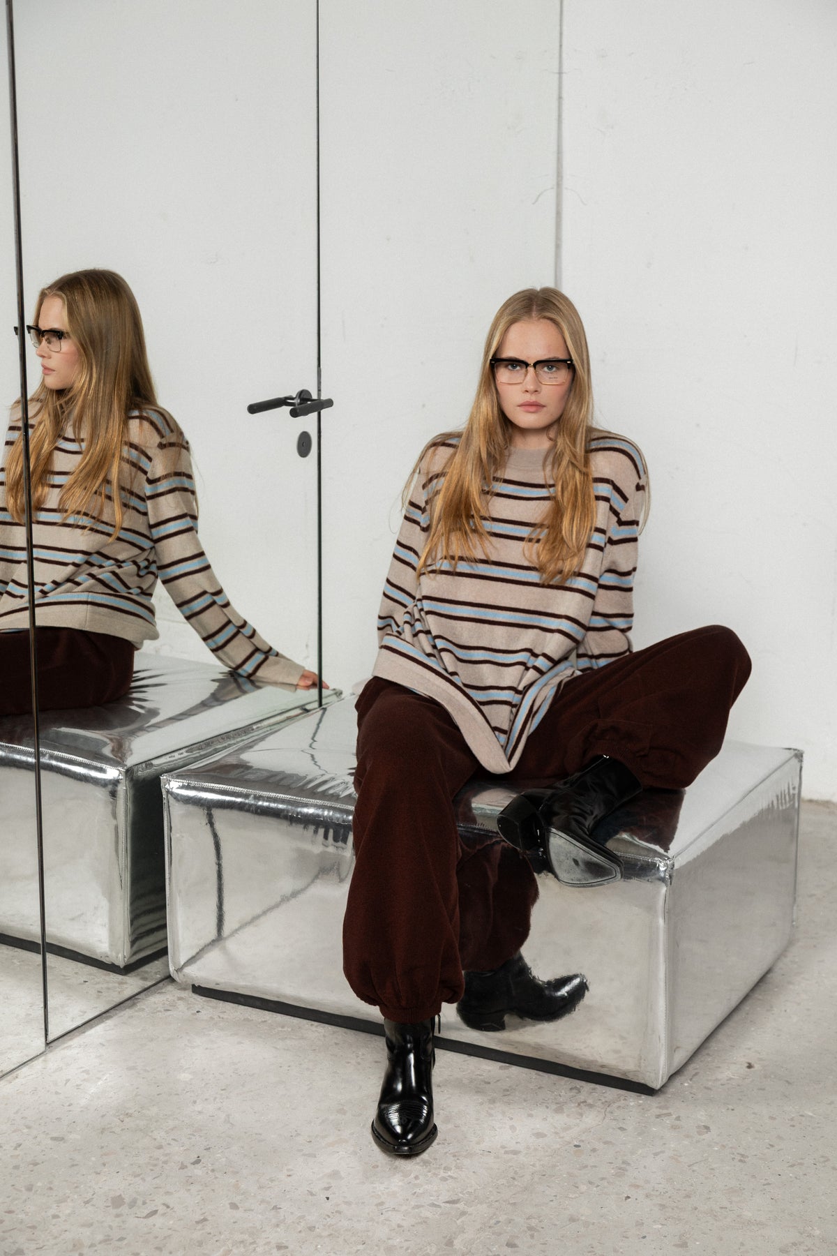 Composition: 100% extra fine merino wool base; stripes in 100% baby lambswool (cloud blue) & 100% baby lambswool (chocolate)