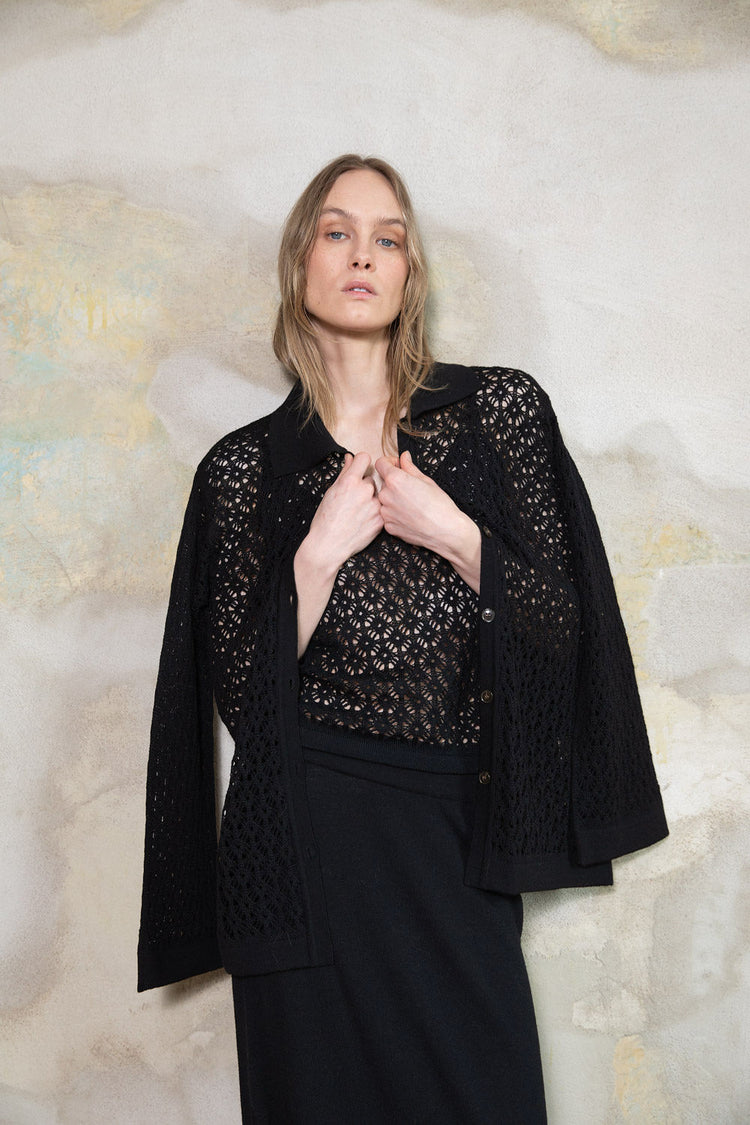 BLACK EXTRA FINE MERINO WOOL LACE TOP